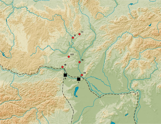 Black squares = Roman fortresses: 1 Petronell-Carnuntum;