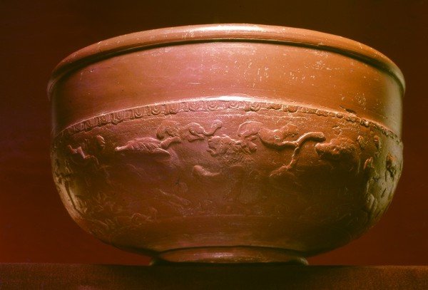 Borský Mikulá�-Borský Peter (SK). Drag. 37 bowl with relief decoration from the Germanic cremation grave. Product of the manufacturing site in Lezoux (2nd half of the 2nd cent. AD).